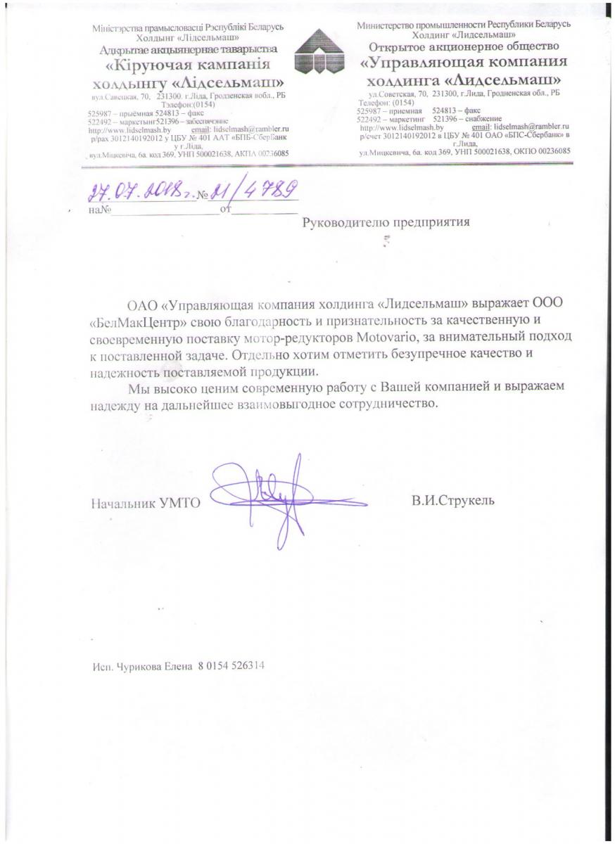 ООО « БЕЛМАК ТЕХНО-СЕРВИС » осуществлена поставка партий редукторов ТМ “MOTOVARIO” для одного из крупнейших предприятий Республики Беларусь в области машиностроения. Завод «Лидсельмаш» основан в 1901 году как чугунолитейный завод, где было налажено производство сельскохозяйственного инвентаря и простейших сельхозмашин для конной тяги. Сегодня ОАО «Лидсельмаш» -одно из ведущих предприятий республики в области машиностроения, производящее 51 наименование сельскохозяйственной техники: картофелепосадочная и картофелеуборочная техника, почвообрабатывающая техника, сеялки, техника для уборки трав и кормов, лесная техника, коммунальная техника. Редукторы ТМ «MOTOVARIO» широко применяются на производстве и имеют безупречную репутацию надежных механизмов.