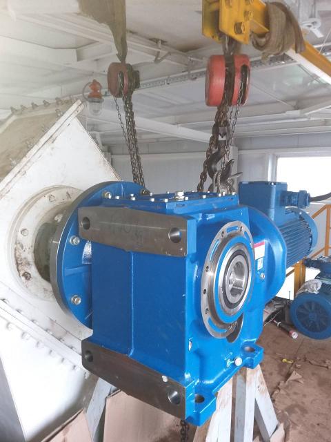 Характеристики изделия: мотор-редуктор “MOTOVARIO” B163, двигатель мощностью 18,5 кВт, взрывозащищенное исполнение, выходной фланец и приводной вал изготовлены по индивидуальным размерам.